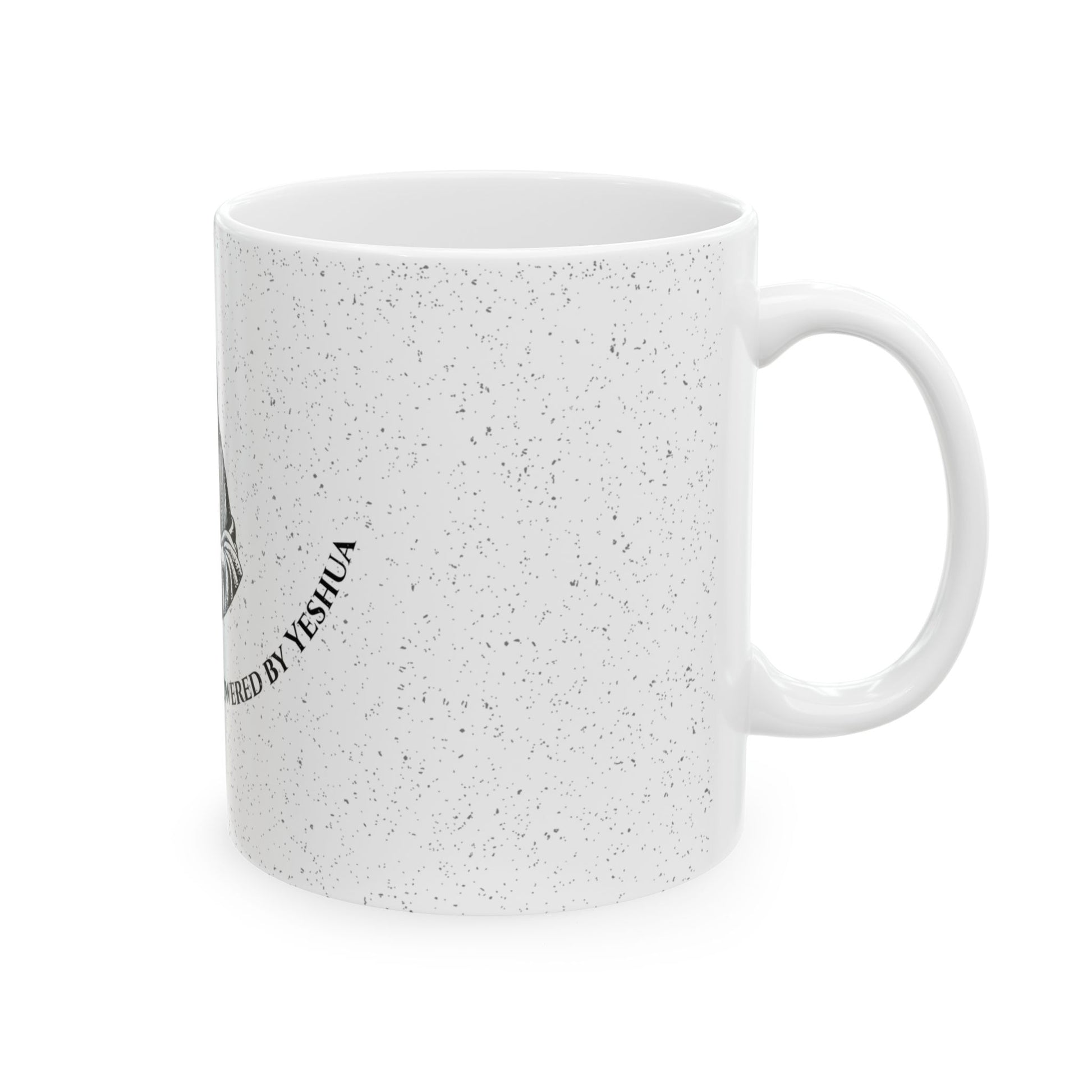 A ceramic mug featuring the design 'Brewed with faith, powered by Yeshua.' This mug gives a comforting and inspirational vibe, perfect for starting your day with positivity. It is relevant to those seeking faith-based encouragement and motivation. Ideal for religious holidays, gifting, or personal use.