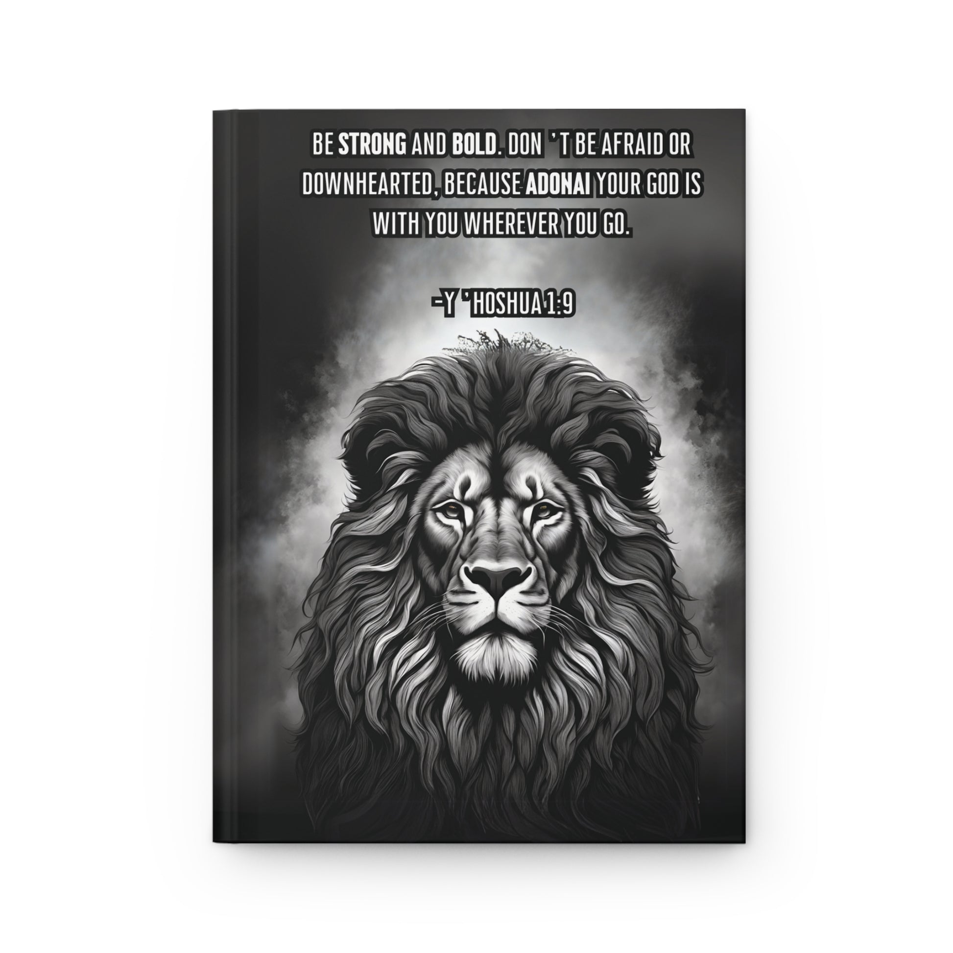 The Lion of Judah Y’hoshua (Joshua) 1:9 (CJB) Journal – A bold, black matte hardcover journal designed for men who seek strength, inspiration, and spiritual growth in their daily walk of faith. With its powerful and motivating design, this journal is ideal for daily reflections, note-taking, or sketching, empowering you to stay focused and inspired throughout the day.